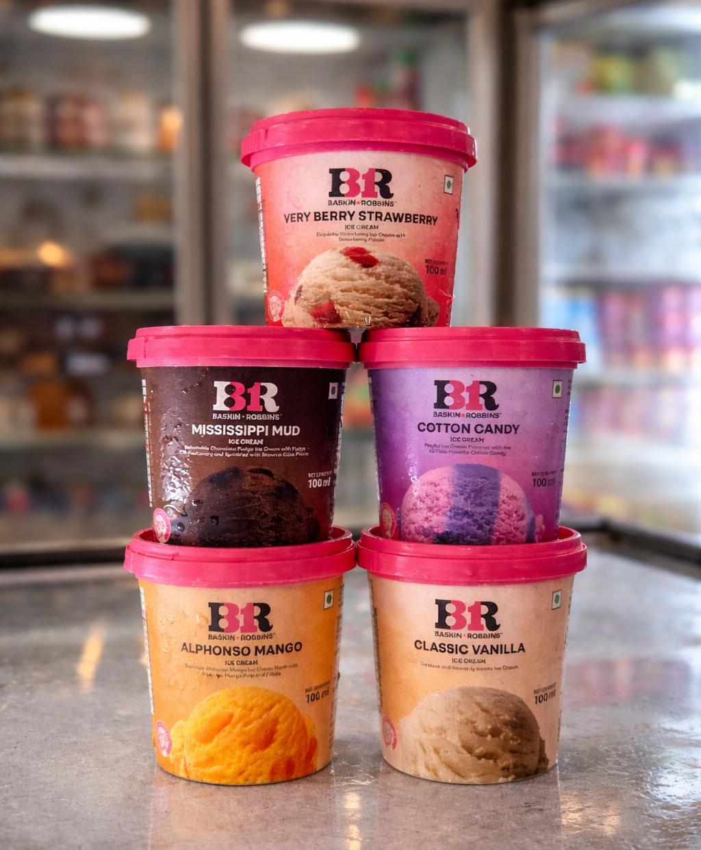 Baskin Robbins – Cup Ice Cream ( Mississippi Mud / Alphonso Mango / Classic Vanilla / Very Berry Strawberry / Cotton Candy ) 100ml